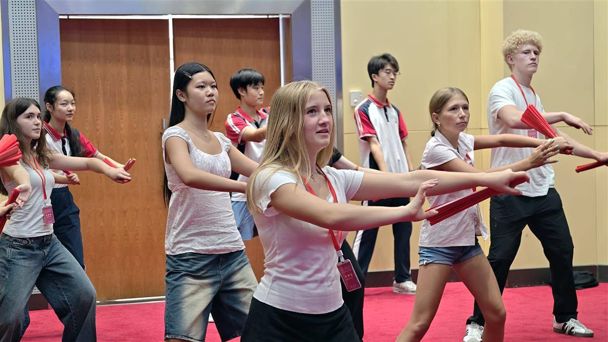 美国“飞虎队”夏令营成员体验太极扇,感受中国武术魅力。