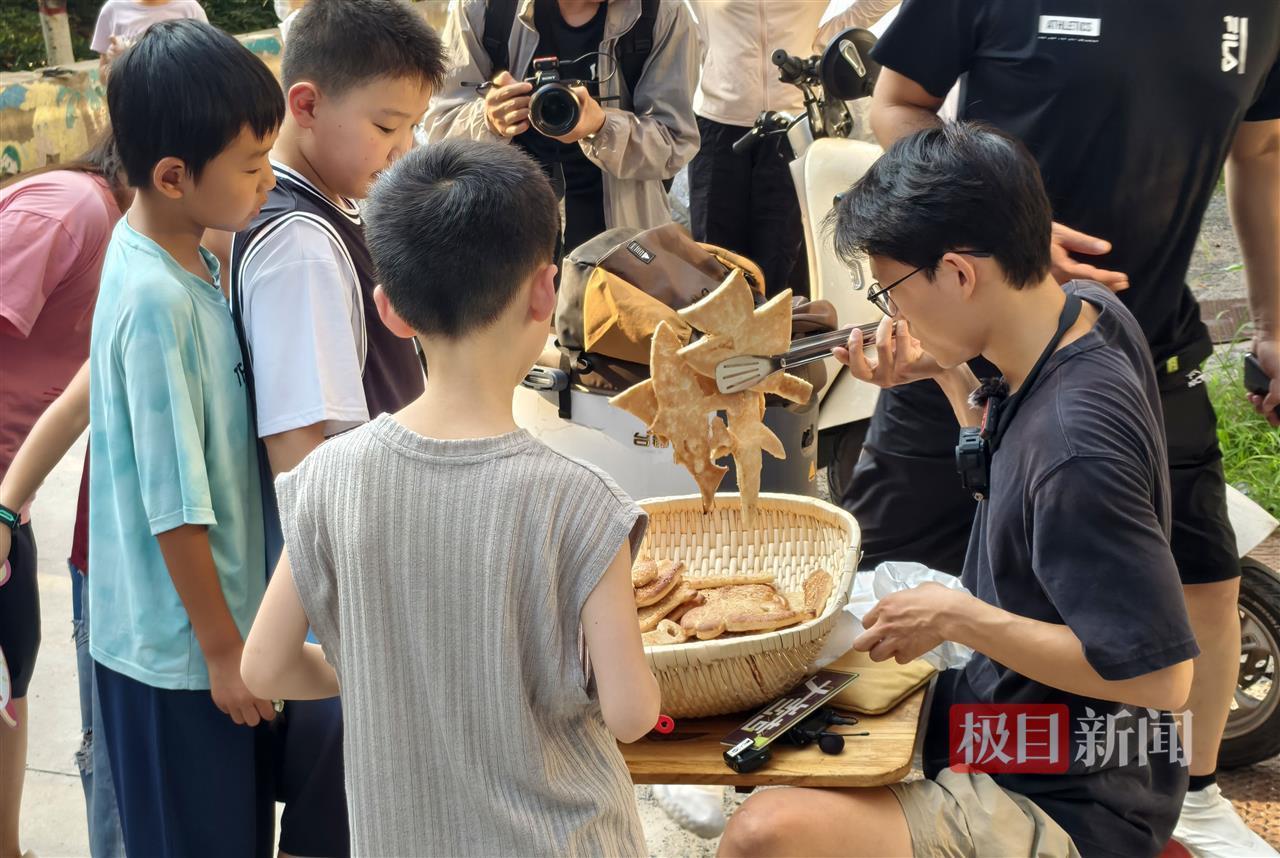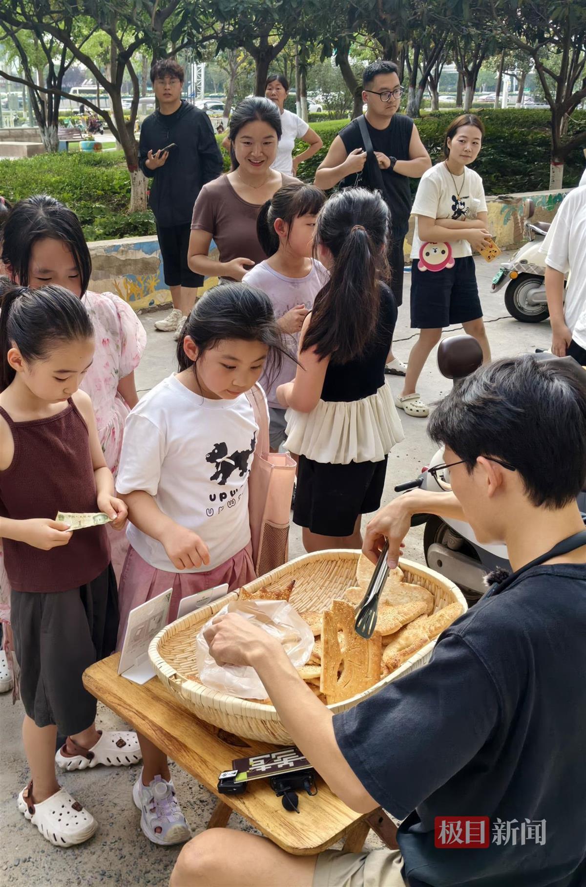 小杨告诉极目新闻记者,最先开始他的烧饼卖过一块钱、三块钱,最后考虑到小朋友的零花钱有限,就降到了一块钱,卖一块钱不赚也不赔,他暂时不会涨价。一开始他也是做着玩,也有很多烤煳了烤断了的失败的作品,后来看着大家这么喜欢也就坚持做了下来。为了满足小朋友的喜好,他的烧饼都是甜口的。小杨说,做烧饼的时候还是很热很累的,但小朋友喜欢就是他最开心的时候。最后,小杨呼吁大家,因为天气太热,排队的人很多,离他太远的小朋友先不要来,目前他将继续做下去。
