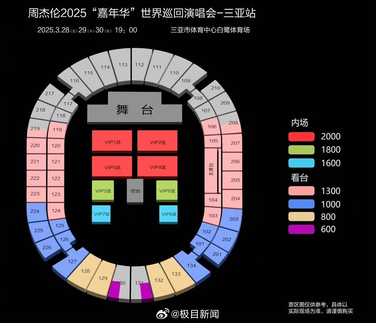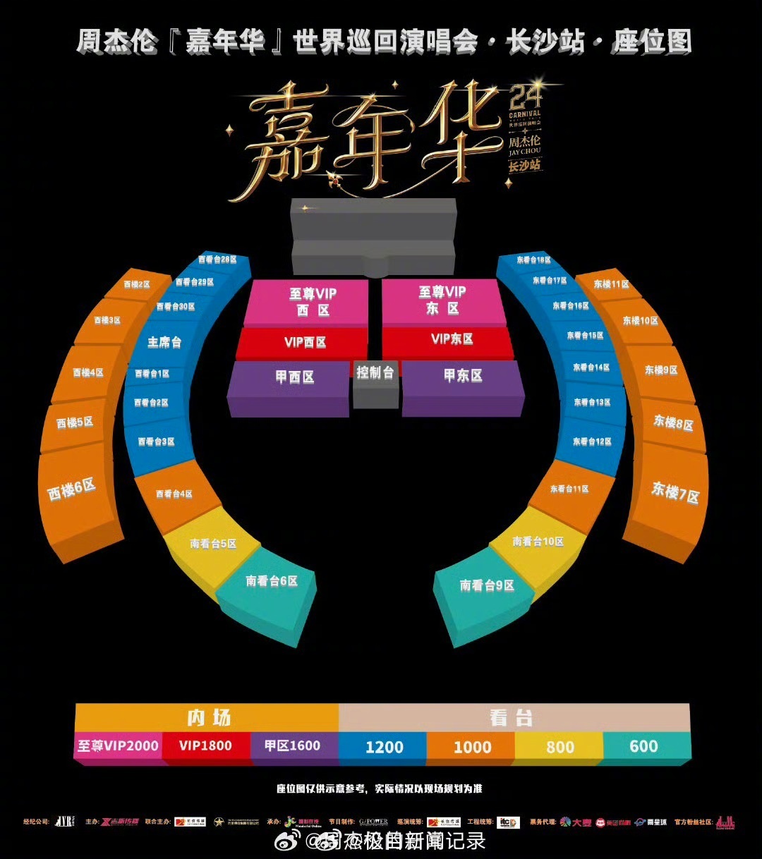 还有不少网友给出了周杰伦厦门站、南宁站、三亚站、长沙站的票图对比,表示武汉站的票图“格外离谱”。@极目新闻 记者关注到,厦门站、南宁站、三亚站中,同属2000元的至尊VIP板块均为4块,长沙站则为两块。而1800元、1600元内场票,几站演唱会对应的区域类似。