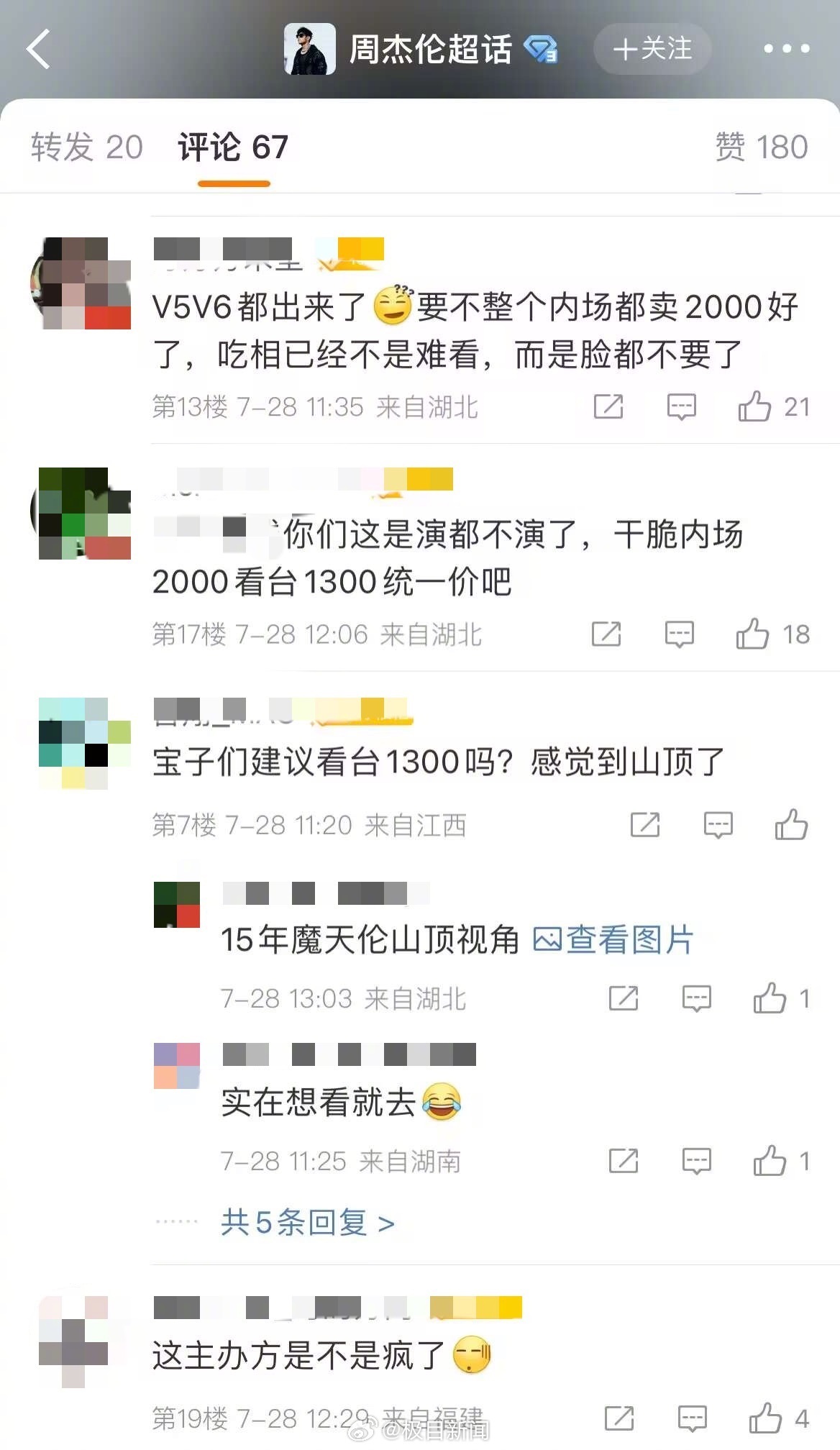 时隔10年再来武汉的周杰伦演唱会,今日13:14将开启抢票模式。而就在29日上午,极目新闻记者关注到,许多网友在社交平台反映周杰伦2025”嘉年华“演唱会武汉站”吃相难看“,原因是,售价2000元的”至尊VIP“内场票档被划分出了6块区域,靠近中控台、在体育场内很可能肉眼看不清周杰伦样子的VIP坐席,卖到了1800元,内场中靠近大屏幕的A区票,买到了1600元。也有网友表示:1300元的看台,很可能会被“发配至山顶”。