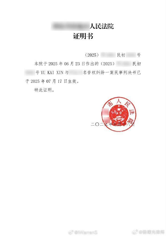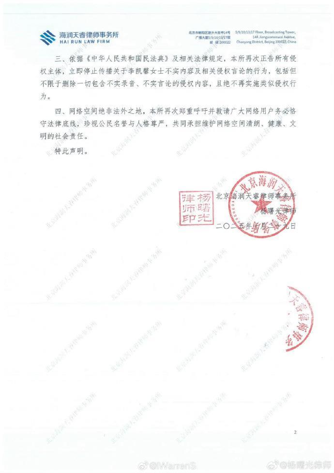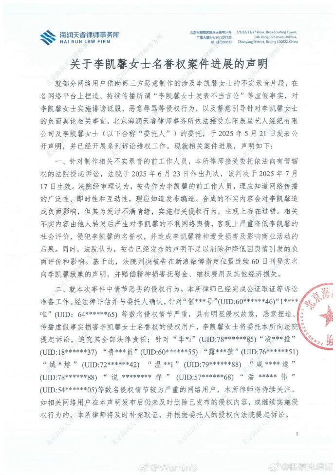 7月29日,李凯馨方律师出具了一份“法院证明”,宣布李凯馨名誉权维权案件,经法院判决获得胜诉结果。李凯馨工作室也转发该声明,并表示:“网络并非法外之地,请立刻停止发布、传播不实信息。针对持续恶意造谣、诽谤李凯馨女士的行为,工作室将依法坚决追究其法律责任,全力维护艺人合法权益。”