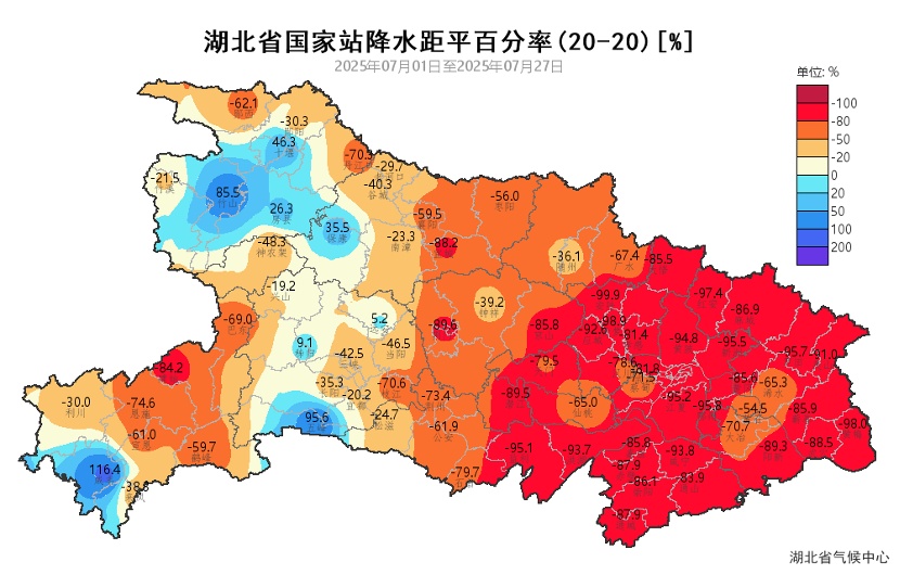 全省7月平均降水量仅73.9毫米,较常年同期偏少六成,暴雨日数仅0.2天,为历史同期最少。其中江汉平原东部、鄂东大部等地降水偏少超过80%。