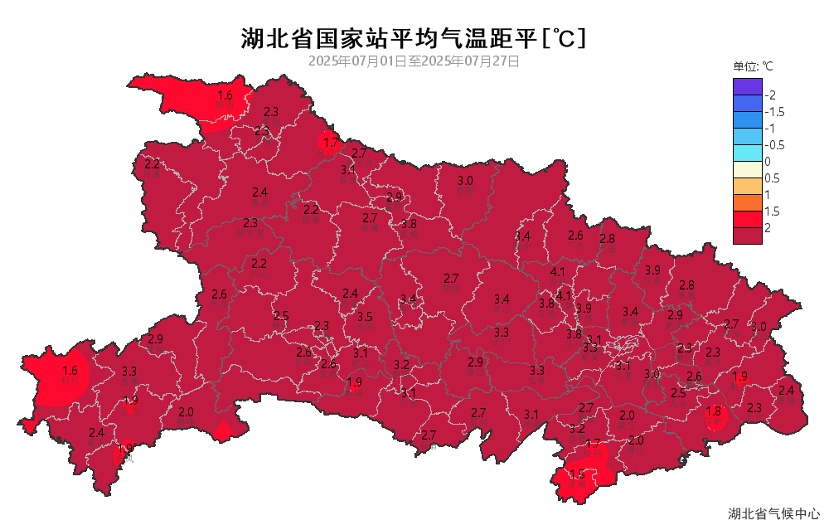 湖北省各县市2025年7月1—27日平均气温距平分布图(℃)