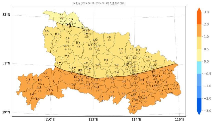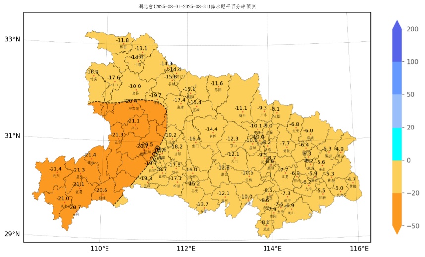 湖北省各县市2025年8月降水距平百分率预测图(%)