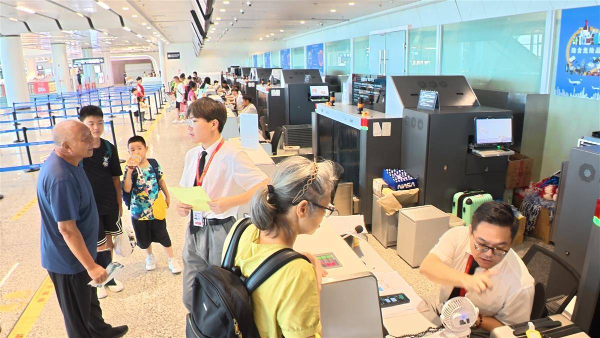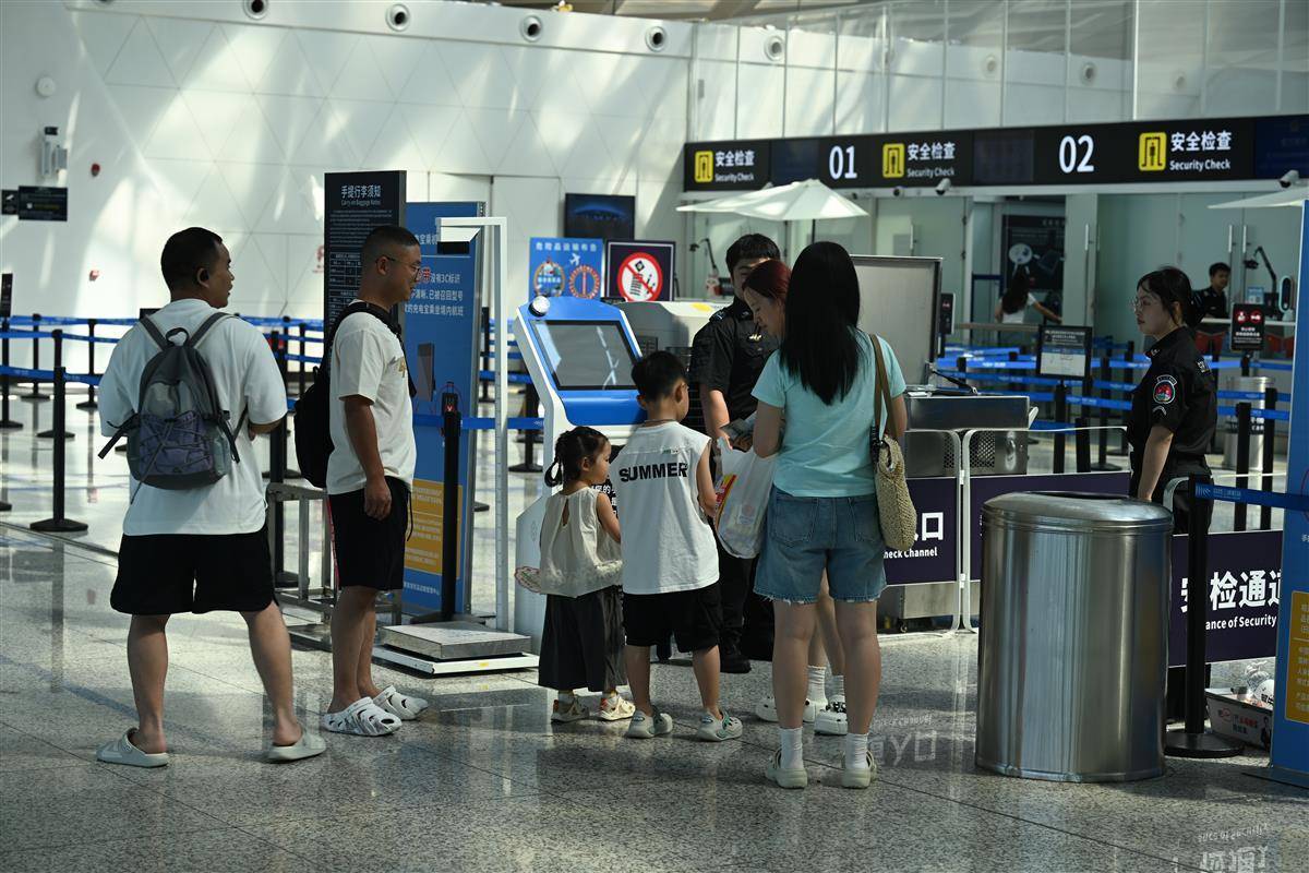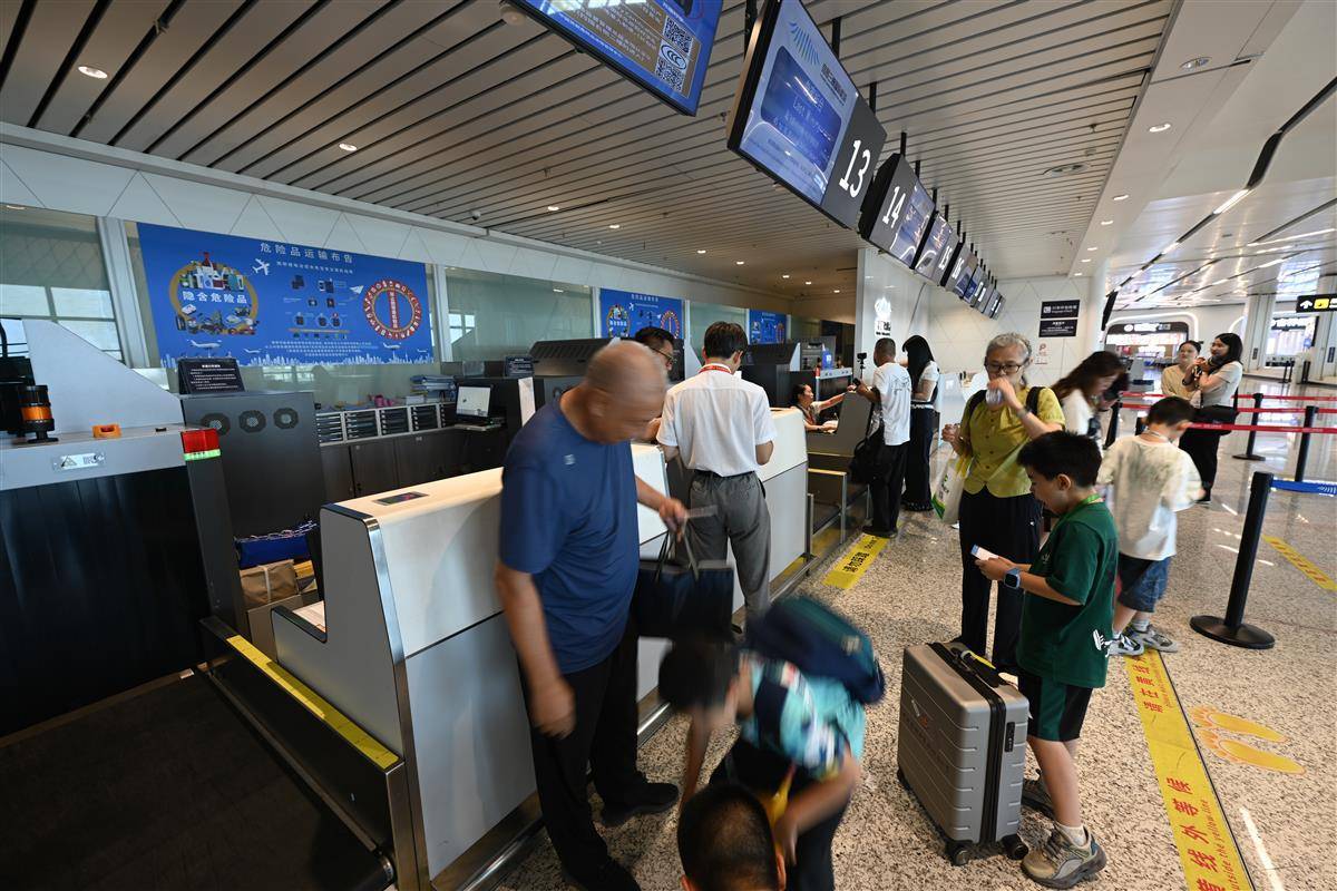 7月29日,记者在宜昌三峡国际机场航站楼内看到,人流如织,值机柜台和安检通道前,旅客们正井然有序地进行值机和行李托运,现场一片繁忙景象。随着暑期旅游旺季的来临,三峡国际机场暑运“热度”持续攀升。据三峡国际机场相关数据显示,今年暑运开始以来,截至7月28日,三峡机场执飞航班已达2548架次,运送旅客31万人次,与去年同期相比,分别实现了22%和25%的增长 。日均起降航班91架次,日均运送旅客1.1万人次。(湖北日报全媒记者 刘曙松 通讯员 蔡晓舒 王婷婷 摄)