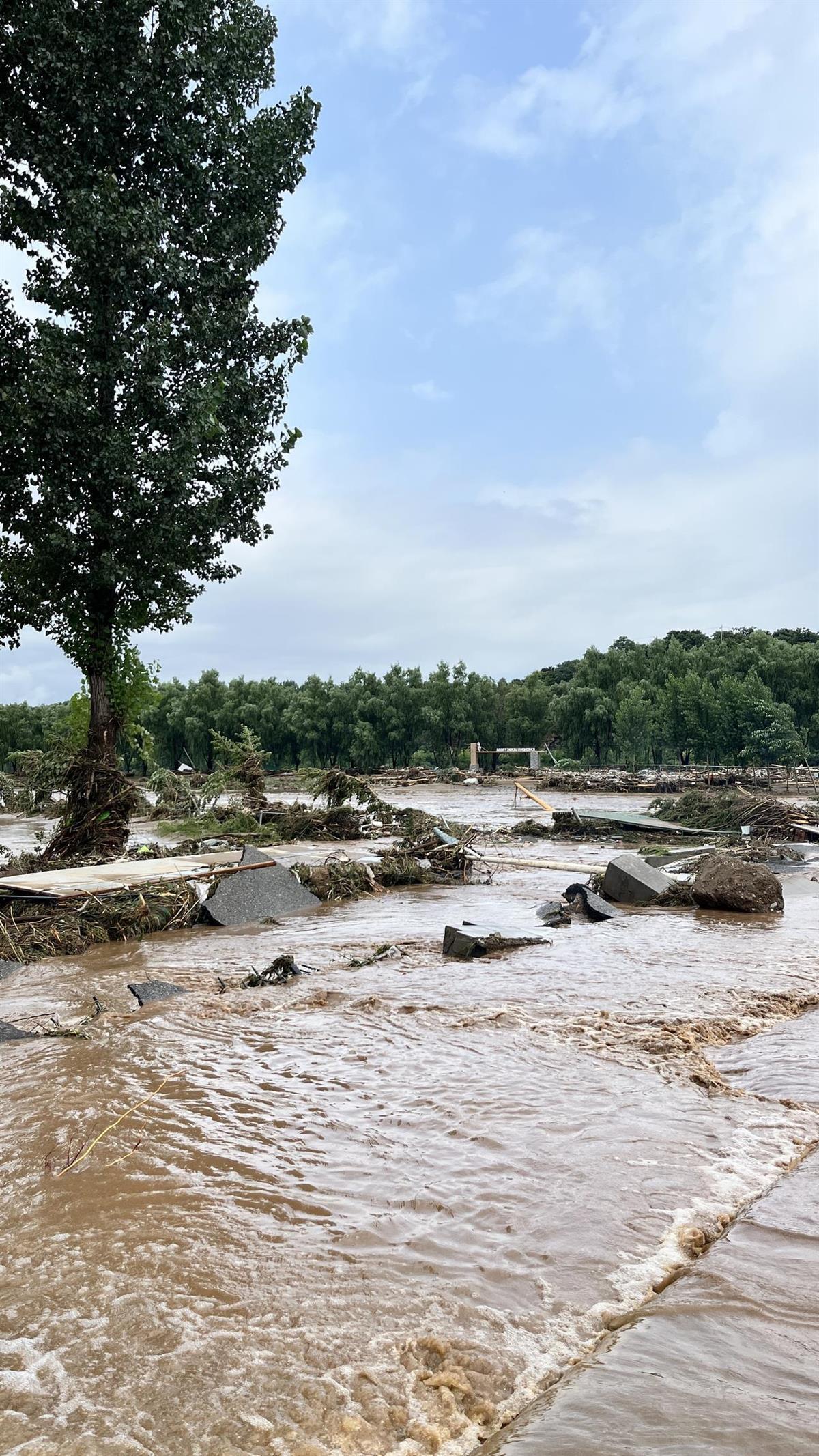 洪水很浑浊,水里还有从上游冲下来的金属件、家电树枝等硬物和杂物。铲车行驶时,也看不见水底下的异物,稍不注意就会扎破车胎。现场有多辆施救的铲车车胎被扎破。