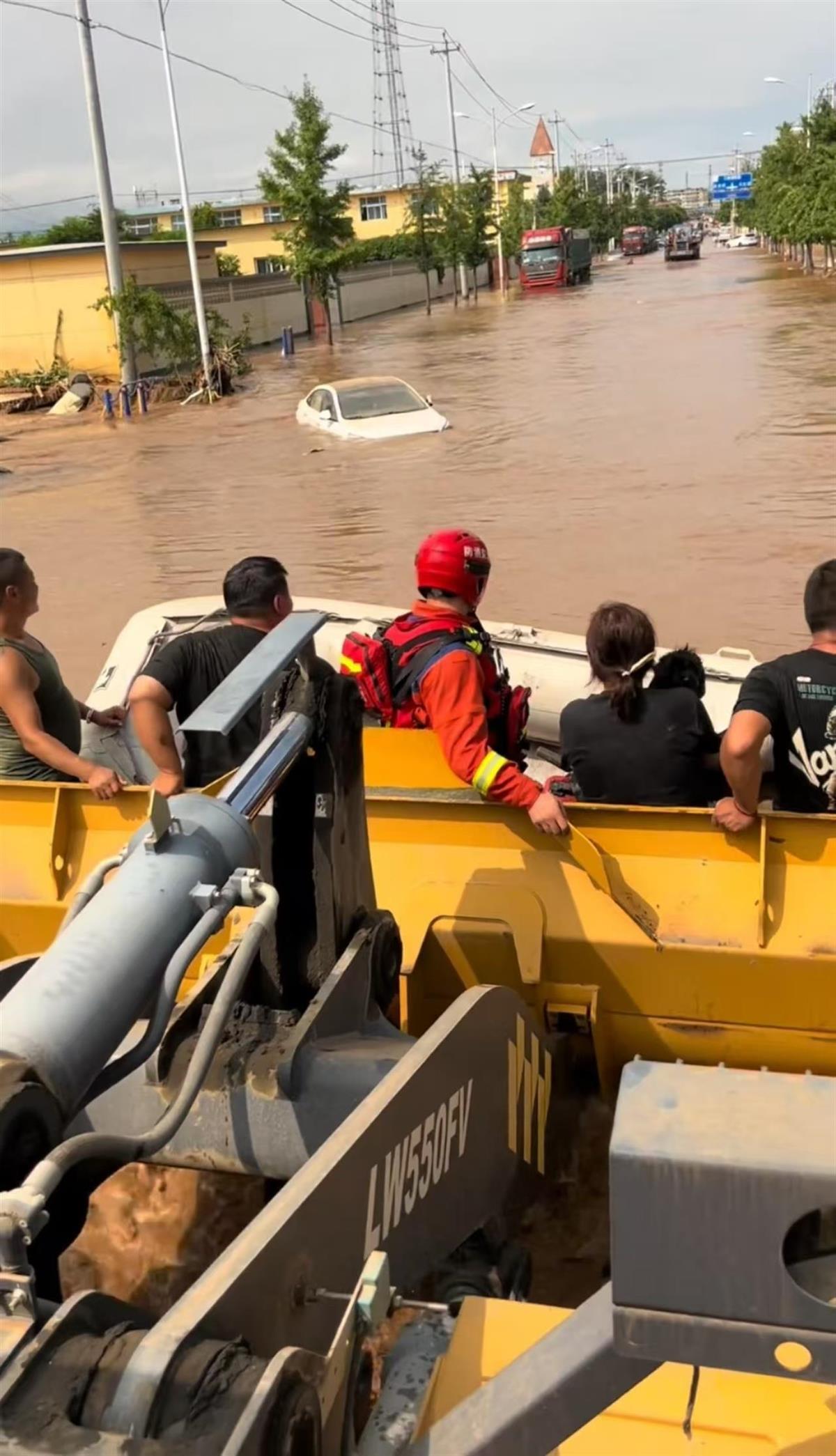葡萄园村受灾严重的地方基本都是平房,早晨7点多刚去的时候,水还没那么深,被困人员就从窗户里翻出来,直接到我车斗上。到了后面,水越来越深,我就把铲车车斗升高,让转移到房顶的人能够顺利地下来。