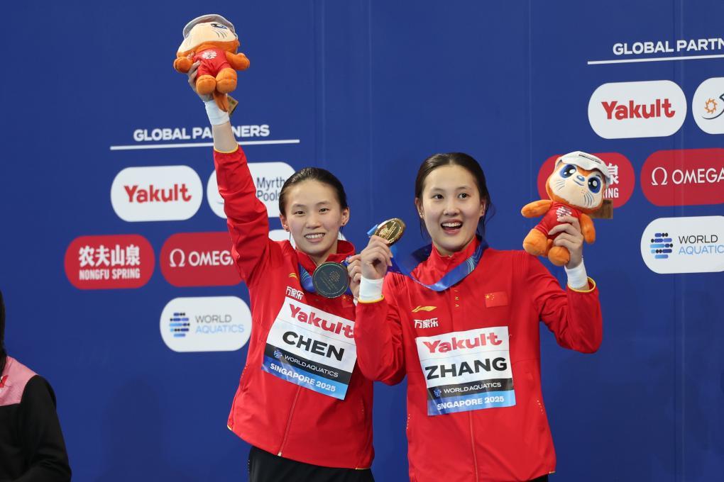 7月28日,陈芋汐/掌敏洁(右)在颁奖仪式上。新华社记者 雒圆 摄