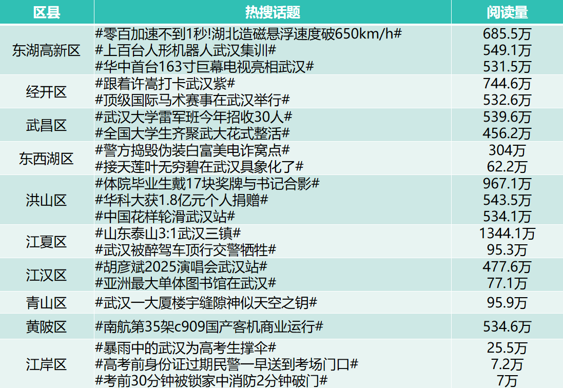 创新活力澎湃涌动,彰显发展硬核实力。6月,武汉各城区在科技创新领域多点突破,前沿成果与产业活力交相辉映,在技术研发与成果转化上,各城区亮点纷呈。6月16日,湖北东湖实验室传来重磅消息,其研发的磁悬浮测试列车稳定达到650km/h,创下目前国内高铁实验室相关测试的最快速度,这一突破引发人民网、工人日报等媒体竞相报道;与此同时,衍生话题#零百加速不到1秒!湖北造磁悬浮速度破650km/h#在快手平台收获685.5万观看量,体现了武汉在高速轨道交通领域的技术领跑优势。此外,东湖高新区发挥属地产业优势,敏锐捕捉6月16日华工科技联合新华社开展的“锻造卓越之品”特别直播这一契机,通过微信公众号跟进报道属地企业动态,借助“理工男团出道”这一新颖传播形式,斩获25000余次点赞关注,以接地气的传播方式拉近了科技与公众的距离。