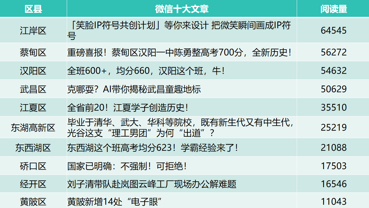 而在高考考场上,滂沱大雨更映照出城市守护的温情底色。法治日报报道《直击暴雨中的武汉高考:“雨再大也不能耽误学生考试”》,聚焦江岸区、武昌区、东湖高新区等地多部门联动,为考生们织密应急服务网络;极目新闻报道《高考圆满收官,武汉黄陂警方和考生一同交上答卷》,则记录了黄陂区民警紧急递送准考证、加急补办身份证件的高效行动,为考生应考保驾护航。在微博平台,#暴雨中的武汉为高考生撑伞##高考前身份证过期民警一早送到考场门口##考前30分钟被锁家中消防2分钟破门#等系列话题累计阅读量40余万,让网民真切感受到武汉各城区在特殊天气下为莘莘学子遮风避雨的责任担当。此外,蔡甸区、汉阳区、江夏区和东西湖区还通过政务微信平台,分享高分学子备考心得、学习方法与成长感悟。这些兼具借鉴意义与励志色彩的分享,既为后续学子提供了可参考的学习路径,也传递出了各城区诲人不倦的教育导向。