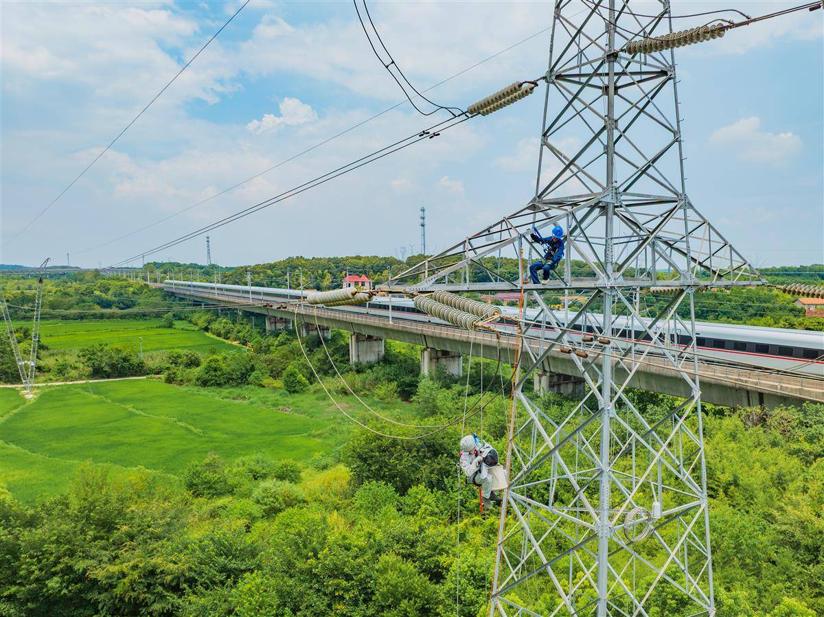 这条220千伏高压线路是京广高铁安全稳定运行的重要电力“大动脉”,跨越运行繁忙的高铁、高速和重要输电线路等复杂环境,对高空带电作业提出了极大挑战。