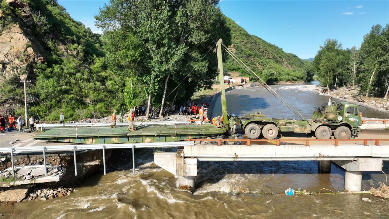 当救援队伍抵近营子村时,一座被拦腰折断的桥梁横亘在官兵面前。受洪水影响,这座王北沟门桥的桥面被冲毁,残余的桥墩摇摇欲坠,湍急的河流肆意奔腾,任务分队指挥员眉头紧锁、语气坚定:“桥梁分队,架桥!”