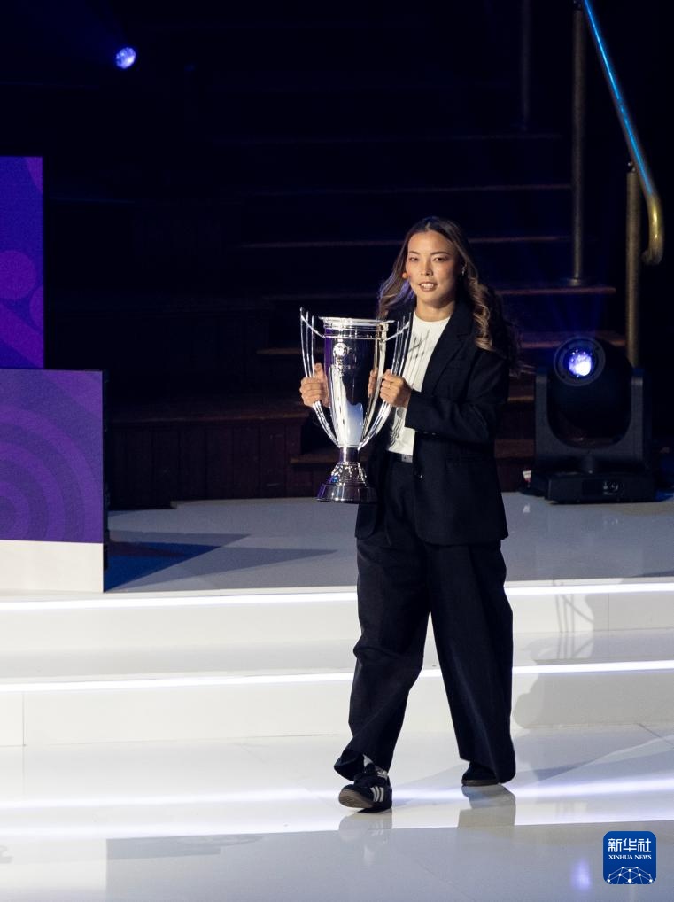 7月29日,中国队球员李梦雯在抽签仪式前代表卫冕冠军中国队归还奖杯。新华社记者 马平 摄