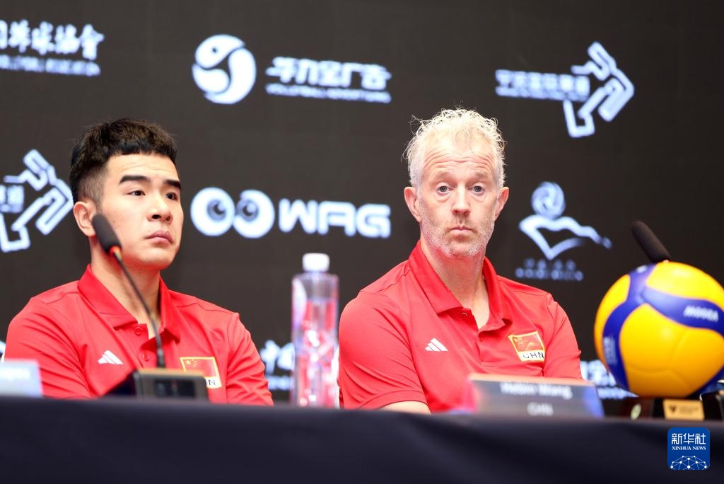 7月29日,中国队主教练维塔尔·海宁(右)和队员王鹤斌出席赛前新闻发布会。新华社发(索向鲁摄)