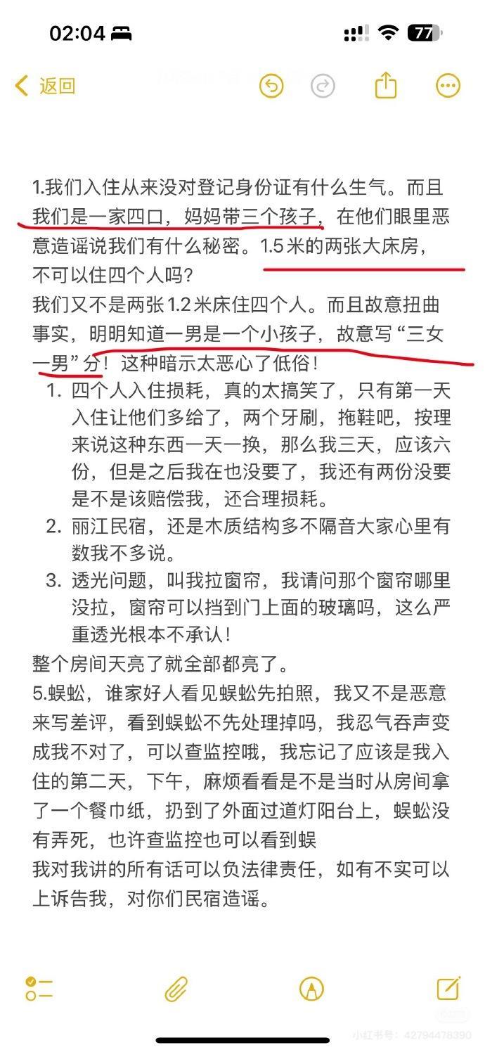 从事件细节来看,商家的回应也是漏洞百出。一方面,商家声称“房间限两人入住”,但消费者指出两张1.5米床完全可容纳四人,且预订平台未明确人数限制,这凸显了商家在服务规范上的随意性;另一方面,商家以“没有监控记录”为由不回应“有蜈蚣”一事,对于消费者提出的其他问题,例如房间小,隔音差,不打扫等问题,也没有任何回应,可以说是对消费者的实际体验和基本诉求,采取了完全无视的态度。