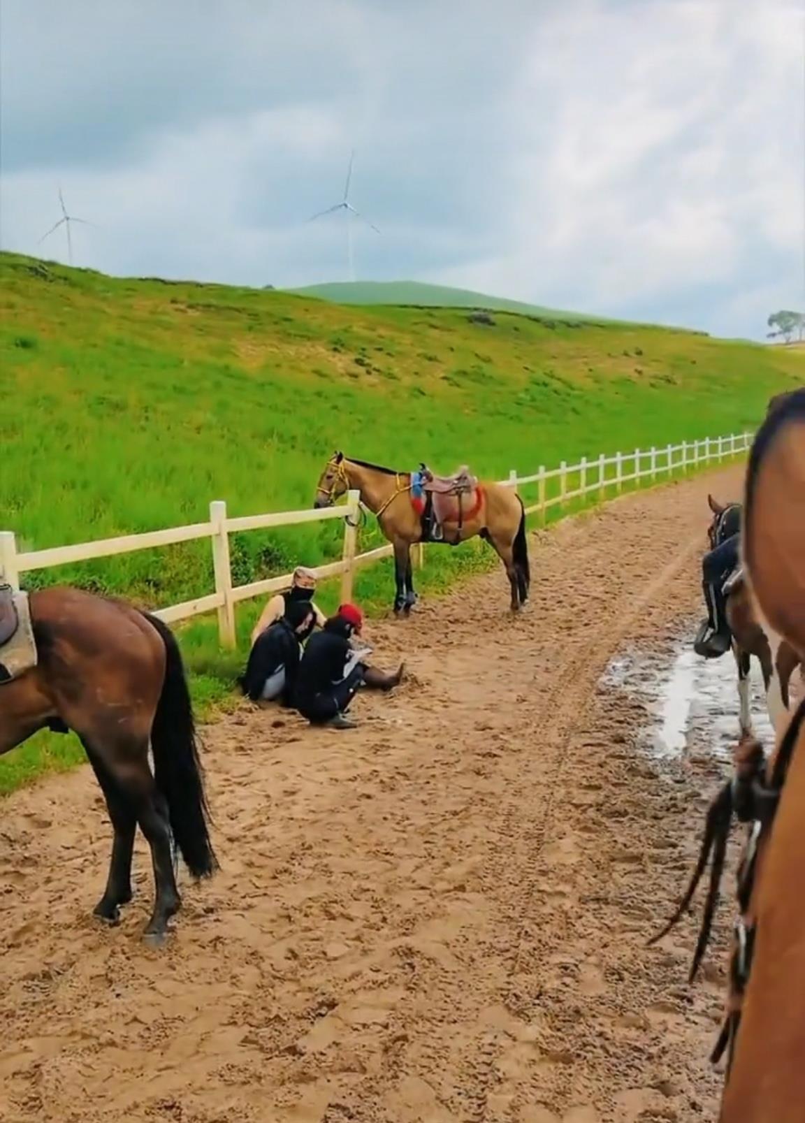 上述网友发布的现场视频显示,一匹马倒在泥泞的积水里,附近有三人或蹲或坐在地上,周边还有许多骑马的人。这匹倒地的马最后被挂在大铲车上拖走。