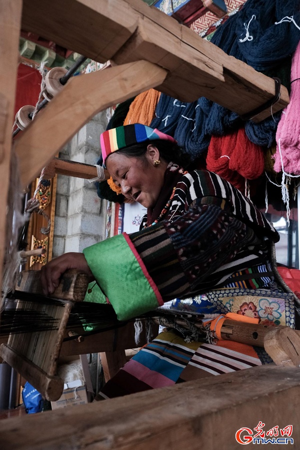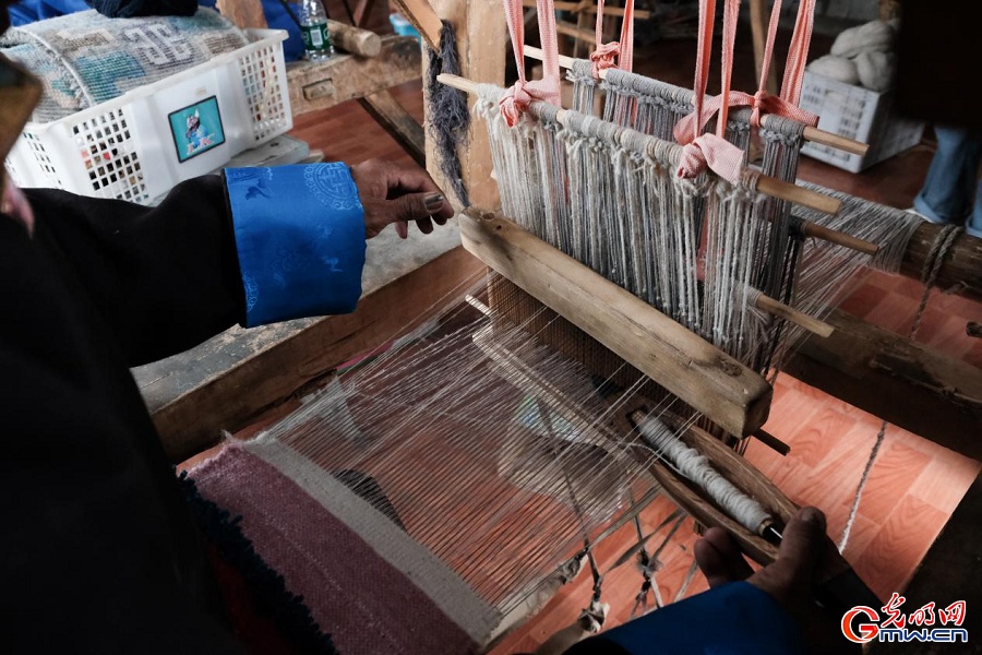Photo taken on July 27, 2025, shows Ngawang Tendar weaving pulu on a loom. (Zhang Andi/Guangming Online)