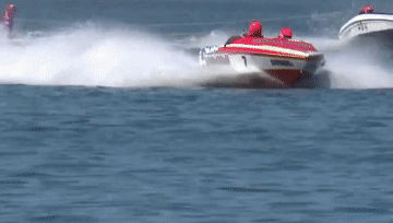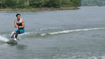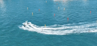 运动员在摩托艇尾浪形成的波浪上自由冲浪