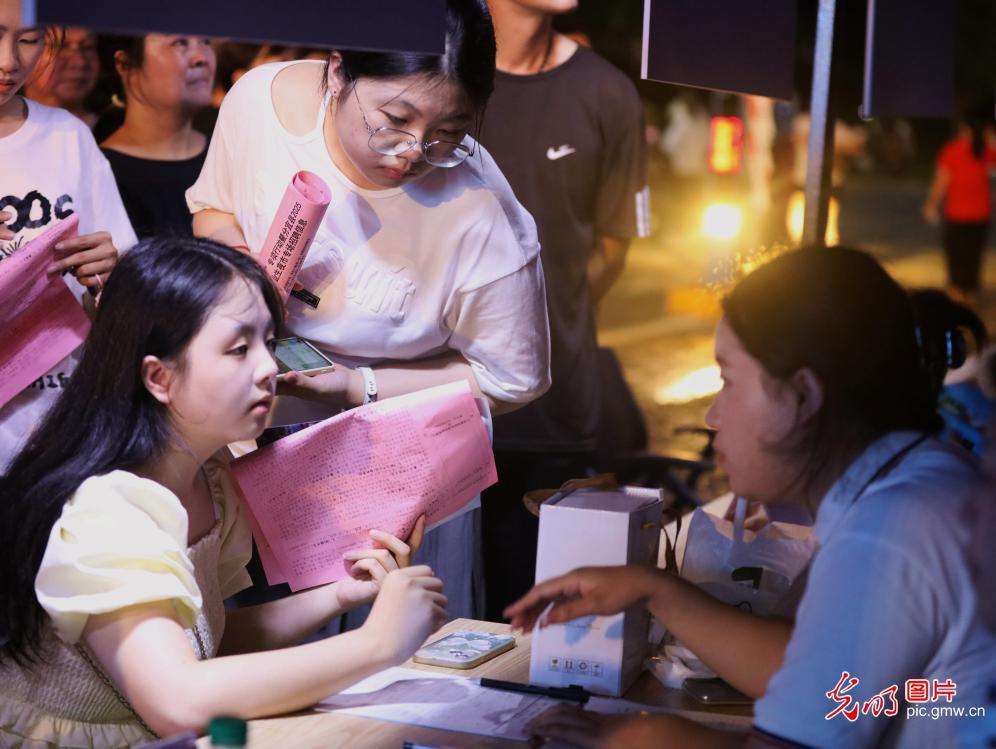 日前,“‘职’夜闪耀 ‘位’你而来”2025年安徽省合肥市暨庐阳区百日千万招聘专项行动夜市专场招聘会在合肥市淮河路步行街百盛广场举行。70余家企业带来家政服务、电商运营、市场营销等优质岗位约2500个,初步达成就业意向300余人。图为求职者在应聘。(葛传红摄/光明图片)