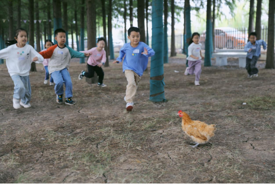 孩子们在峒山栖客露营基地进行摸鱼捉鸡体验。张万恬梓摄