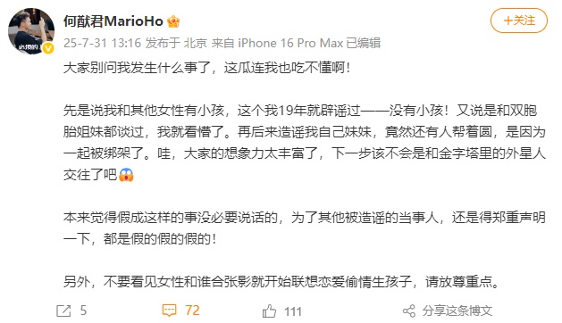 先是说我和其他女性有小孩,这个我19年就辟谣过——没有小孩!又说是和双胞胎姐妹都谈过,我就看懵了。再后来造谣我自己妹妹,竟然还有人帮着圆,是因为一起被绑架了。哇,大家的想象力太丰富了,下一步该不会是和金字塔里的外星人交往了吧。