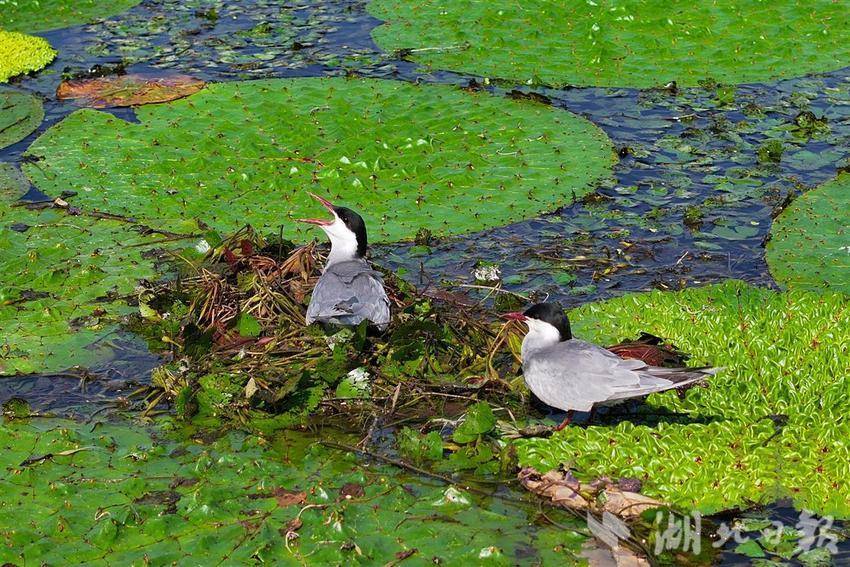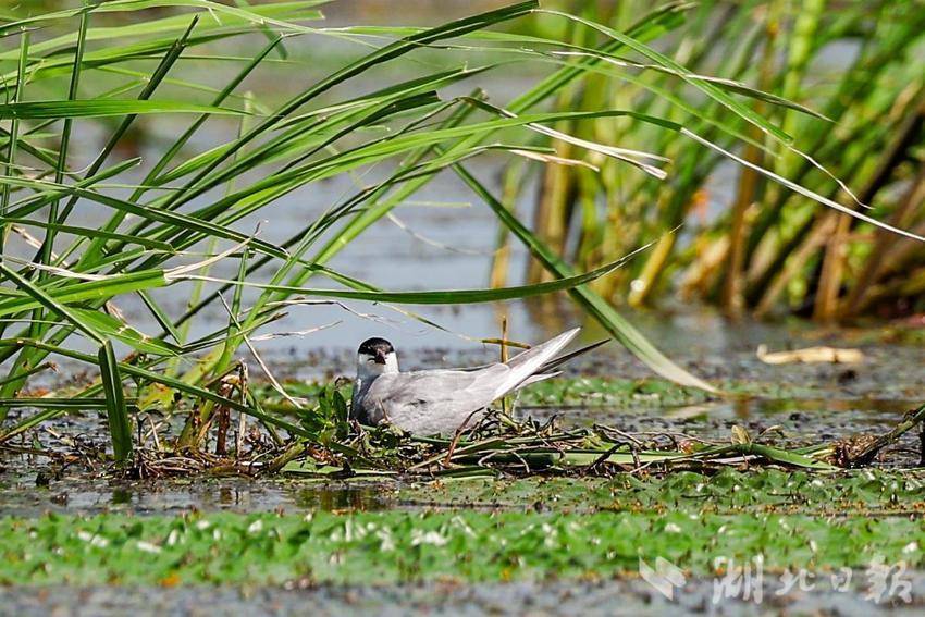 6月16日,在洪湖朱斗湖附近水域,须浮鸥正在水草上栖息。(湖北日报全媒记者 倪娜 摄)