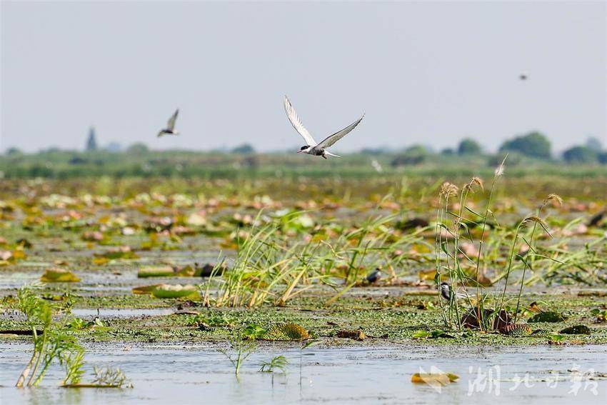 近日,在洪湖朱斗湖区域荷花荷叶长势良好好,防风浪作用明显,密密麻麻的荷叶荷花如同“水中桃源”,吸引了成千上万须浮鸥前来筑巢繁衍。(湖北日报全媒记者 倪娜 摄)