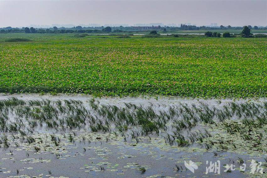 6月16日,在洪湖朱斗湖附近水域,长势良好的荷叶水草,为放风浪起了明显作用。(湖北日报全媒记者 倪娜 摄)