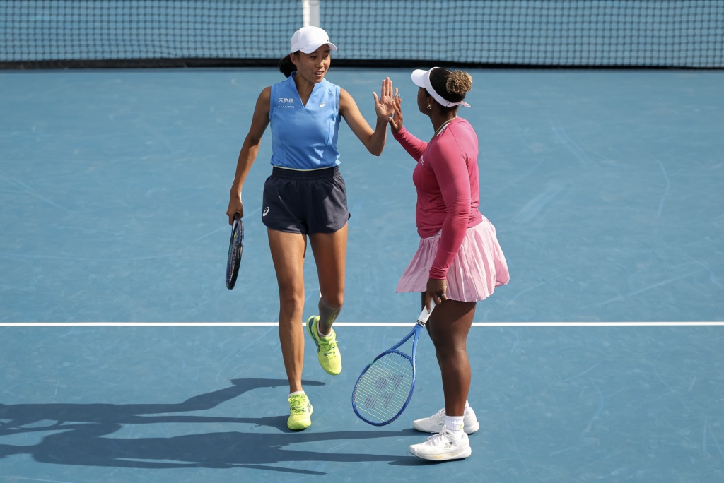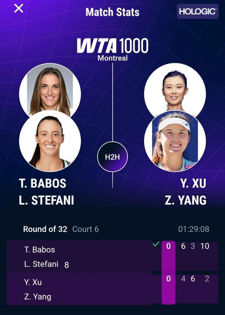 双打比赛中,蒋欣玗和詹皓晴面对主场作战的加拿大选手克罗斯和姆博科表现稳定,在攻防两端表现均优于对手,最终以6:3和7:6(0)赢得首轮比赛的胜利。