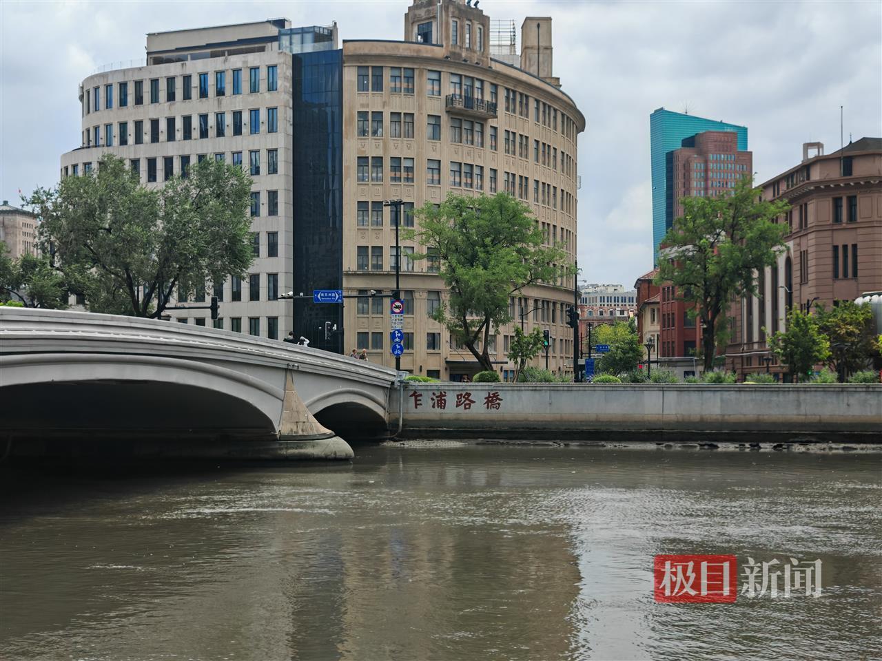 外滩附近的乍浦路桥名已完全显露,桥上人来车往,一切如常。不少市民和游客来此散步,还有人专程来打卡乍浦路桥。他们一边播放之前的视频,一边对比水位情况。记者近距离观察,乍浦路桥名和河道内壁还能看到清晰的水痕线,河面漂浮着树枝树叶。
