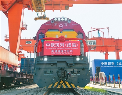 在四川省成都市青白江区的成都国际铁路港,一列中欧班列(成渝)南通道速达班列发车。