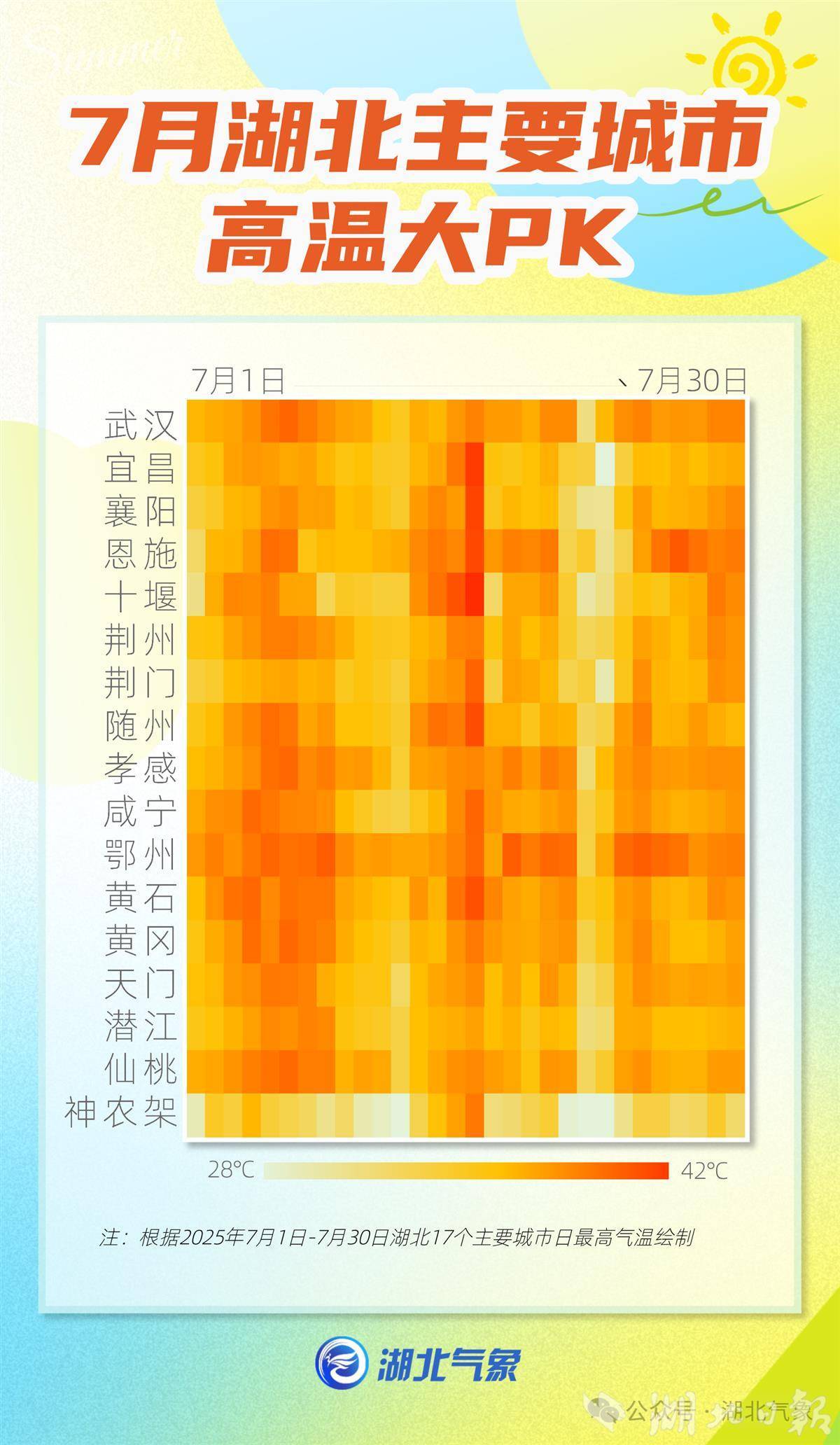 今年7月,是湖北65年来最热的7月。一组数据刷新了自1961年有完整气象记录以来的多项高温记录——平均气温30.5℃、平均最高气温35.7℃、高温日数21.1天,三项关键指标全部创历史同期新高。为何这么热?后期还要热多久?7月31日,湖北省气象专家进行了解释。