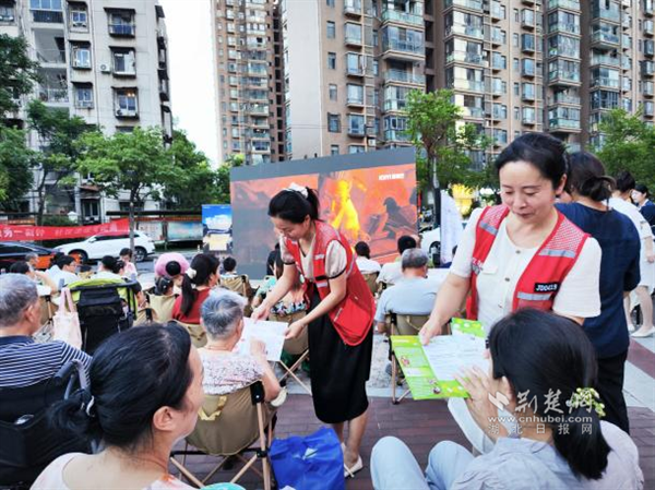 荆楚网(湖北日报网)讯(通讯员 王银铁)7月30日傍晚,武昌区积玉桥街道尚隆苑社区法治广场上,一场别开生面的禁毒宣传正随着电影幕布缓缓拉开。在区禁毒办和街道办事处的指导下,街道禁毒社工及志愿者将禁毒课堂“搬”进露天电影现场,让居民在纳凉观影的同时,收获一份“禁毒安全礼包”。