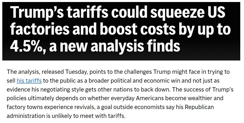 美国华盛顿公平增长中心进行的一项最新研究发现,特朗普政府的关税可能会冲击美国制造业,使美国工厂成本最高增加4.5%。从长期看,关税最终或将拖累美国的经济效率。