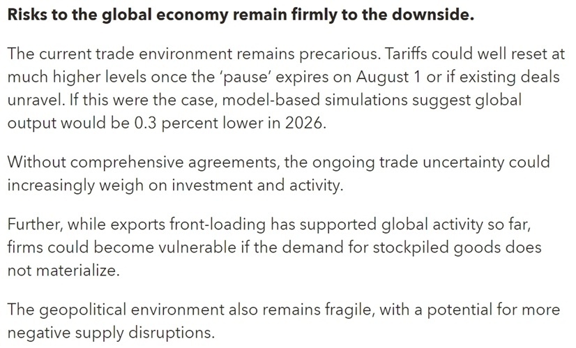 在谈及上调增长预期的原因时,IMF报告称,这是由于今年以来,全球基于对美国加征关税的预期,经济活动提前“加速”,以及当前美国的实际关税税率低于4月发出的威胁。但即便如此,最新数据仍低于年初预测的3.3%的世界经济增长率。