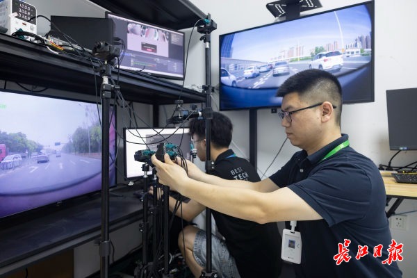 黑芝麻智能应用工程部总监陶星团队调试摄像头,验证华山A1000芯片对应车型定制整体方案运行时的稳定性、安全性。长江日报记者胡冬冬 摄