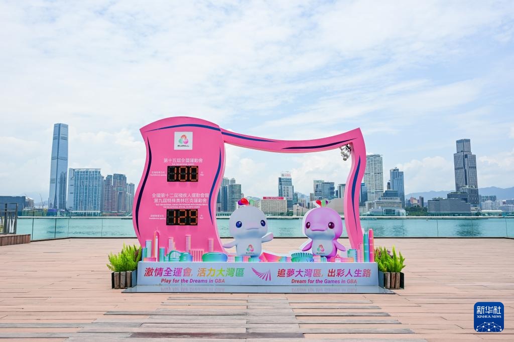这是8月1日拍摄的香港维港沿岸的第十五届全国运动会倒计时牌。