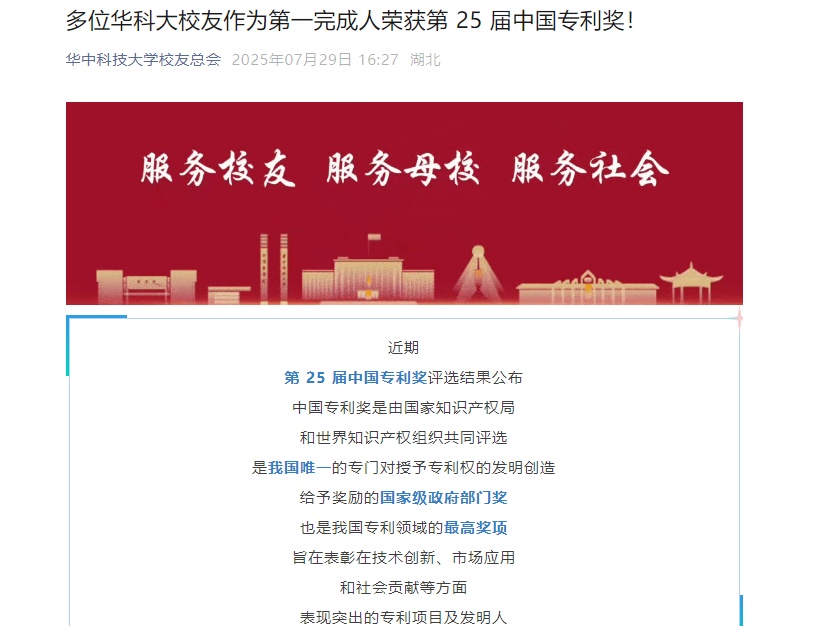 湖北日报讯(记者张歆)日前,第25届中国专利奖评选结果公布。根据华中科技大学校友总会公开信息,多位华科大校友获奖。