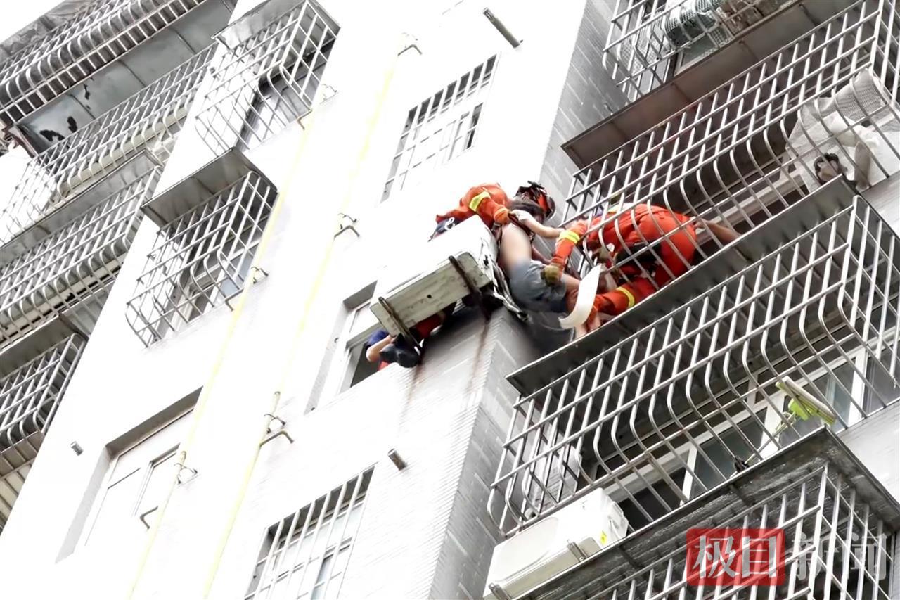 指挥员当机立断,改为破拆九楼厨房防盗网实施人工救援。一名经验丰富的消防员穿戴全身吊带,从窗口探出身体为女孩喂水补充体力,并将安全绳固定在其身上。