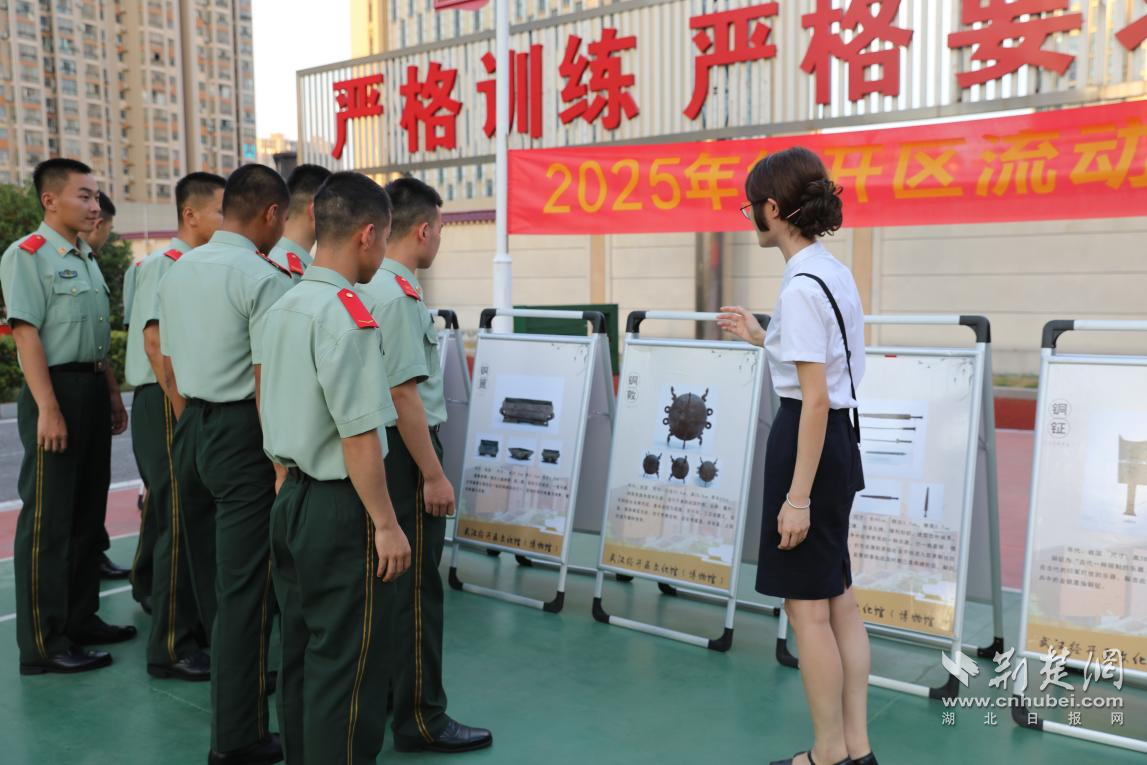 在开展演出活动的同时,区文化馆(博物馆)还给驻区武警官兵带来了“流动博物馆”进军营文化演示和非遗传统文化体验活动。“流动博物馆”文化演示活动通过图文展板、文物复制品展示和生动地讲解,官兵们“零距离”接触武汉经开区的历史文化,了解本土历史变迁,从一件件“小文物”中感悟时代发展的“大意义”。非遗传统文化体验让官兵们零距离领略传统技艺的独特魅力,手工“金石拓印”体验环节,官兵们在专业指导下亲手操作,沉浸式感受中华优秀传统文化的博大精深。
