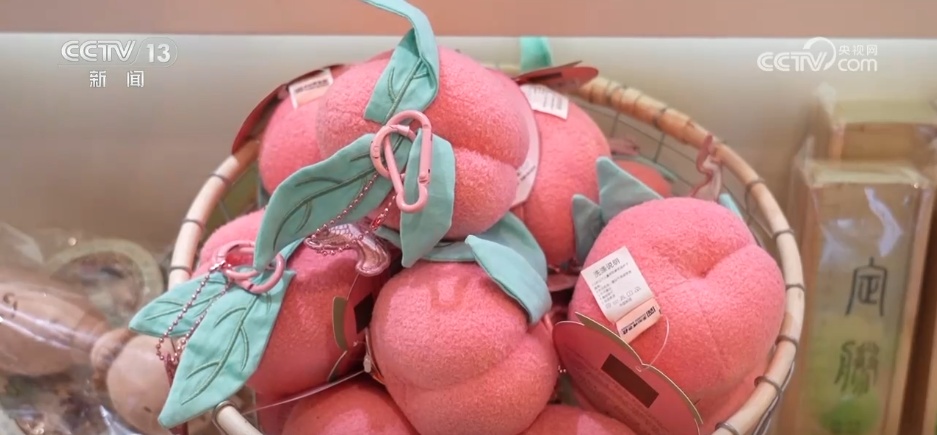 同样出片的还有这款叫做“鹤桃”的萌趣挂件,它是从馆藏画作《缂丝鹤桃》中汲取的灵感,您看摆在园中,像不像一盘真的水蜜桃呢?