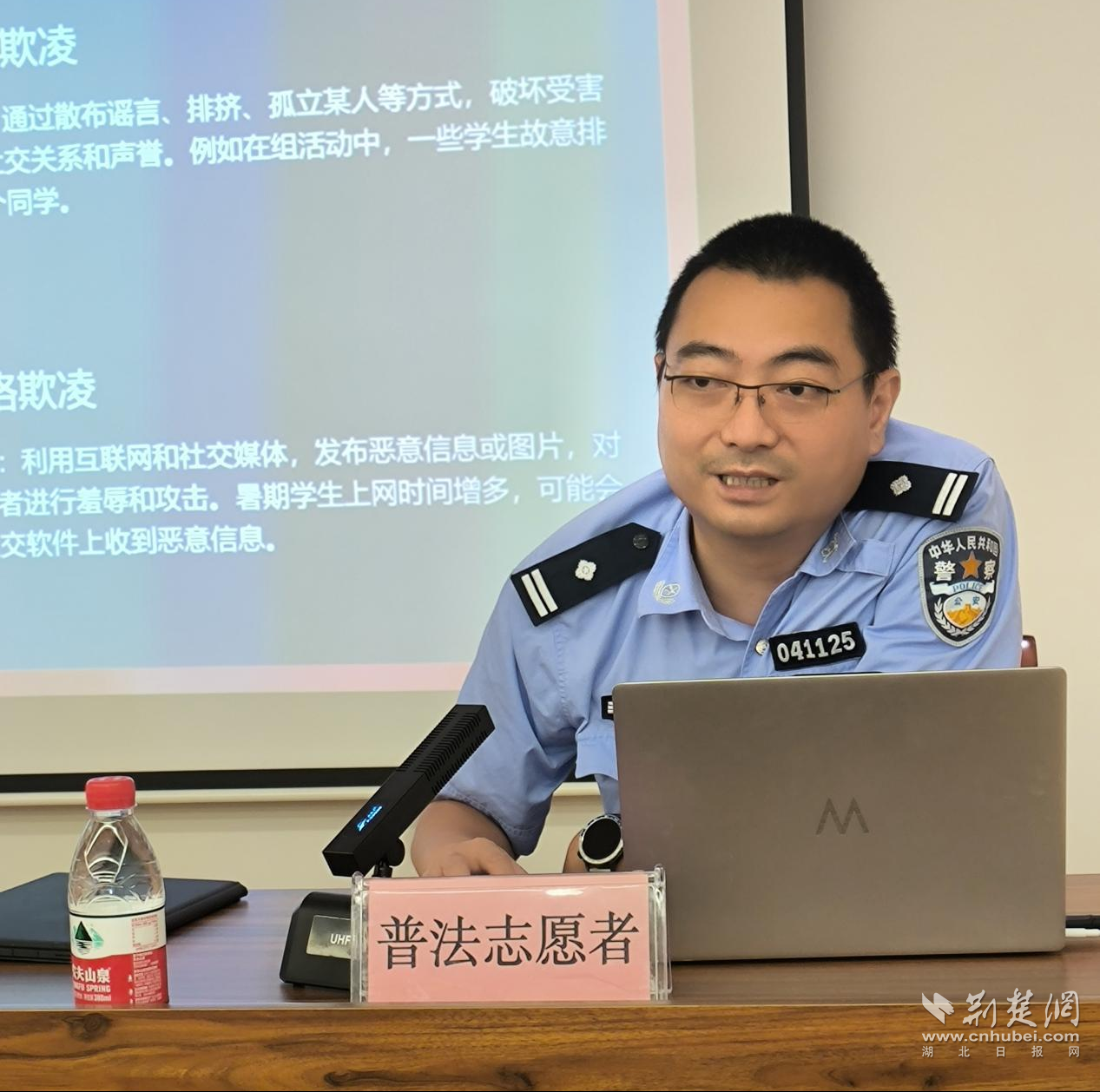 区公安分局盘龙派出所普法志愿者代表、副所长冮强拉开了“法治青风”普法小课堂的序幕,冮所长从法律法规出发,系统全面地为同学们介绍了校园霸凌的定义、表现形式、危害、内在逻辑和新《中华人民共和国治安管理处罚法》对未成年人违法犯罪行为处罚的最新规定,充分明确法律保障,帮助未成年人。从肢体冲突到言语侮辱,再到网络暴力和社交孤立,每一种霸凌形式都通过典型案例一一呈现,让同学们深刻认识到校园霸凌并非小事。
