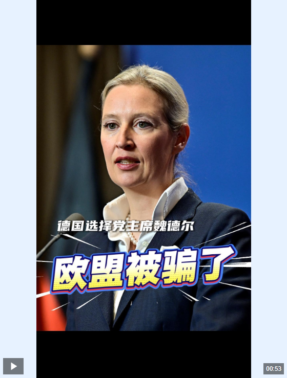 德国选择党主席魏德尔7月30日表示,欧盟与美国达成的贸易协议是“特朗普的协议”,欧盟和欧盟委员会主席冯德莱恩都“被骗了”。魏德尔说,这一协议根本不符合欧洲民众的意愿,“这是荒谬的,显示了欧洲的软弱”。