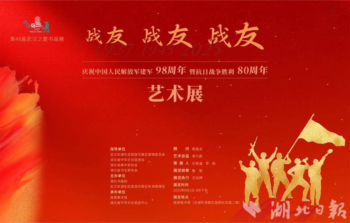 湖北日报讯(记者农新瑜、通讯员王灿婷)8月1日,由湖北书画院、武汉东湖生态旅游风景区听涛管理处主办的“战友!战友!战友!——庆祝中国人民解放军建军98周年暨抗日战争胜利80周年艺术展”,在东湖屈原美术馆启幕。该展览是第48届“武汉之夏”系列活动之一,不仅为市民暑期文化生活增添亮色,更以艺术之名赓续红色血脉。