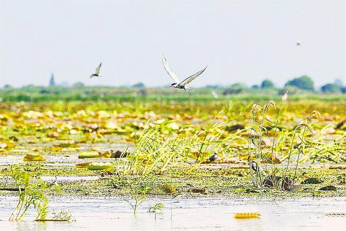 洪湖朱斗湖附近水域,须浮鸥正在水草上栖息。(湖北日报全媒记者 倪娜 摄)