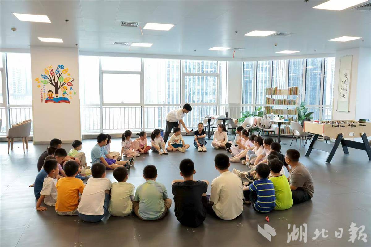 如今,托管班已开启第2期,服务了100多名白领子女。大约300平方米的空间里,孩子们或坐在地上阅读,或端坐桌前学习,有时跟着老师学武术招式,有时咿咿呀呀练习汉剧唱腔,有时认真听防溺水安全课,学得认真、玩得开心,欢声笑语不断。