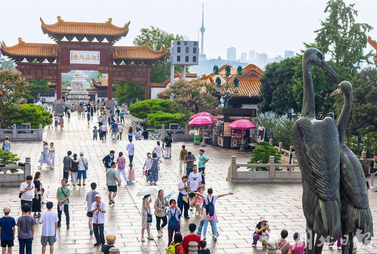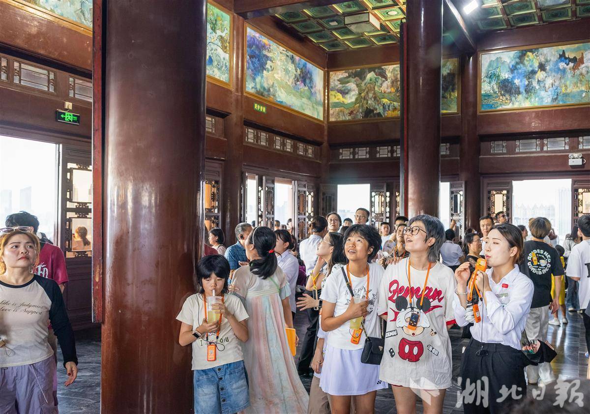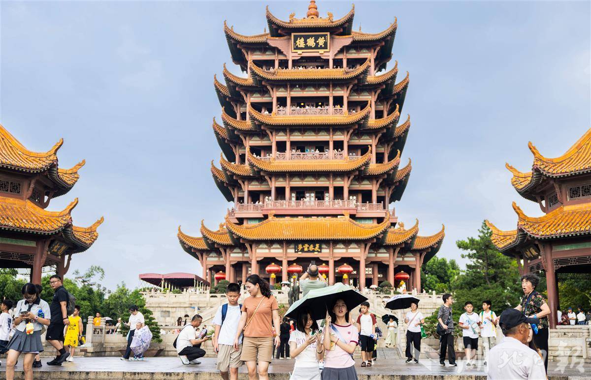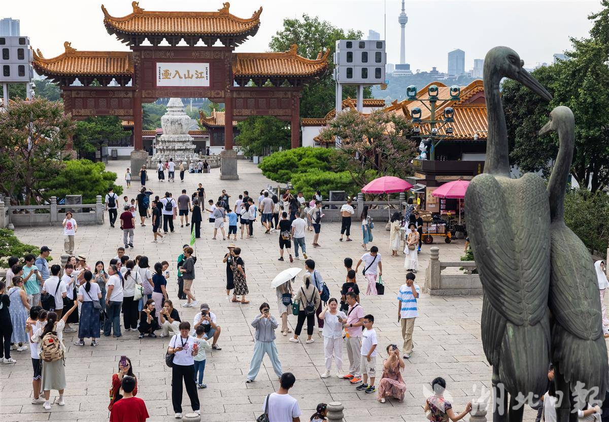 8月1日,武汉高温晴热,黄鹤楼景区内游人如织,暑期旅游热度持续攀升。当天景区预约游客量超过13500人,众多游客慕名而至,穿梭于亭台楼阁间,感受这座千年名楼的独特魅力。(湖北日报全媒记者 薛婷 摄)