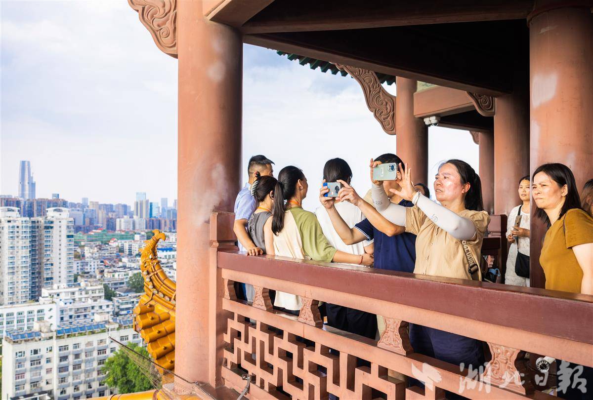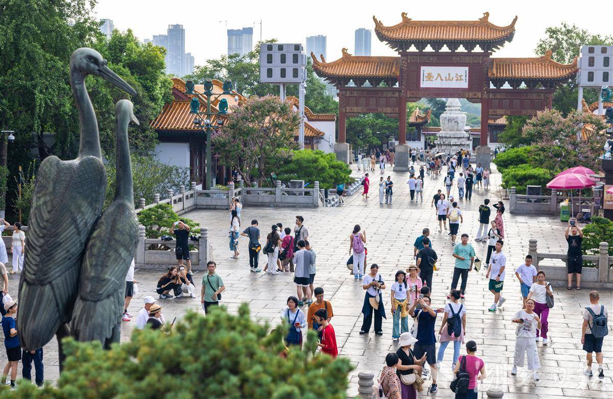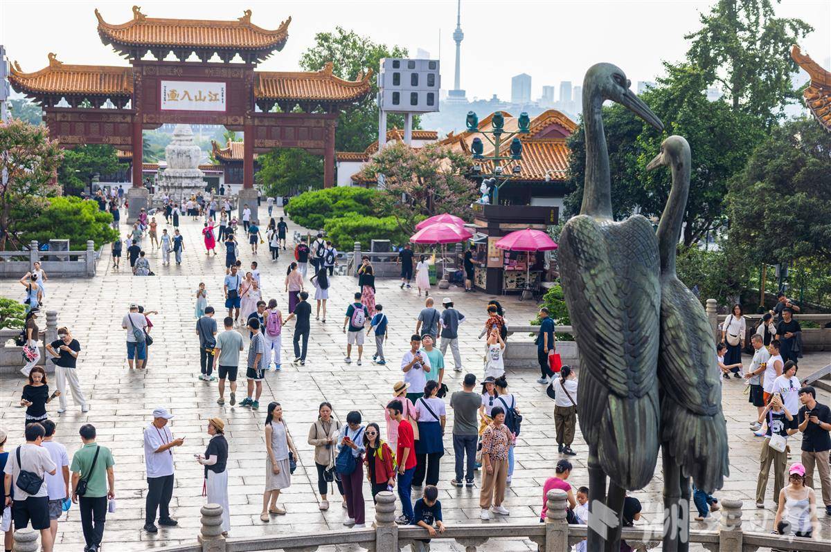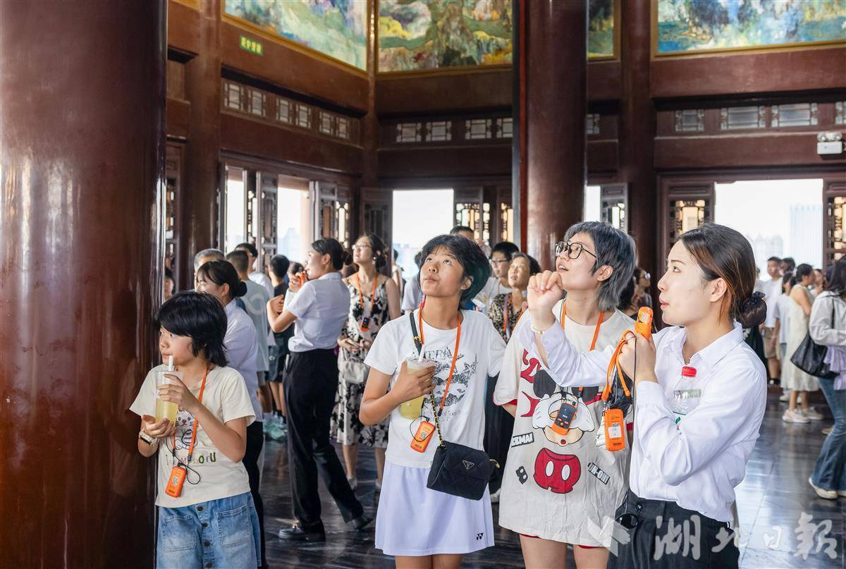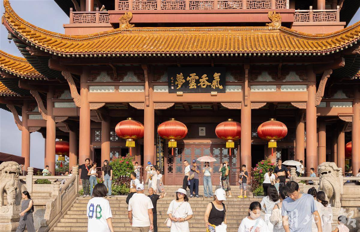 8月1日,武汉高温晴热,黄鹤楼景区内游人如织,暑期旅游热度持续攀升。当天景区预约游客量超过13500人,众多游客慕名而至,穿梭于亭台楼阁间,感受这座千年名楼的独特魅力。(湖北日报全媒记者 薛婷 摄)