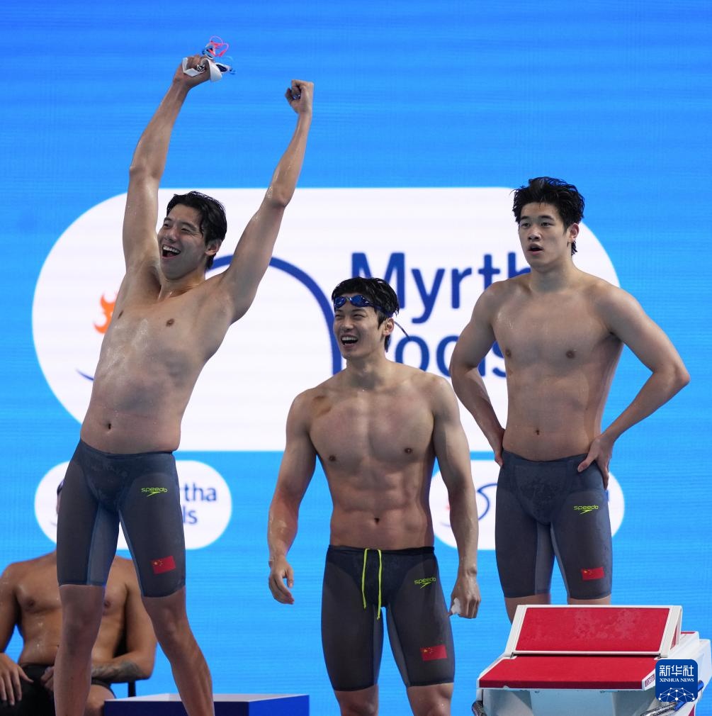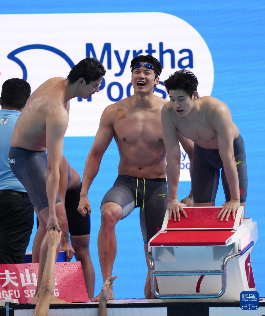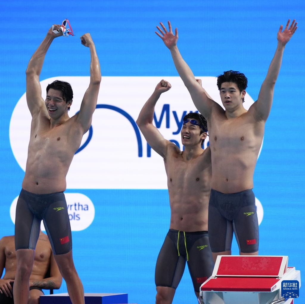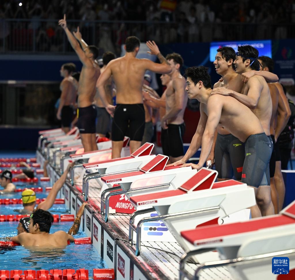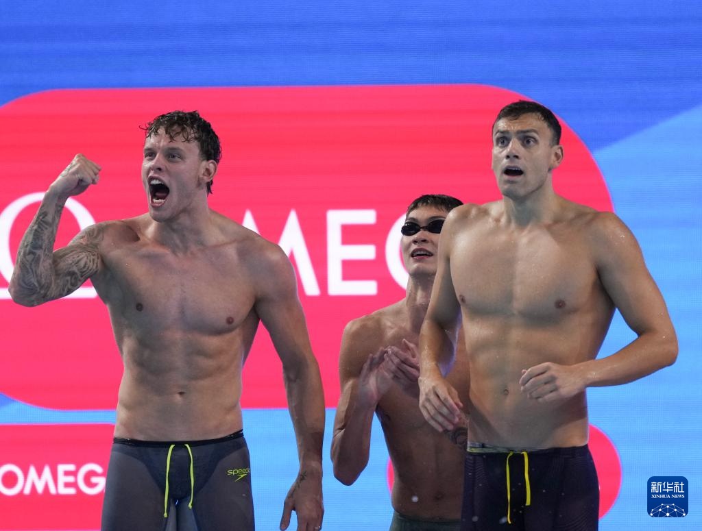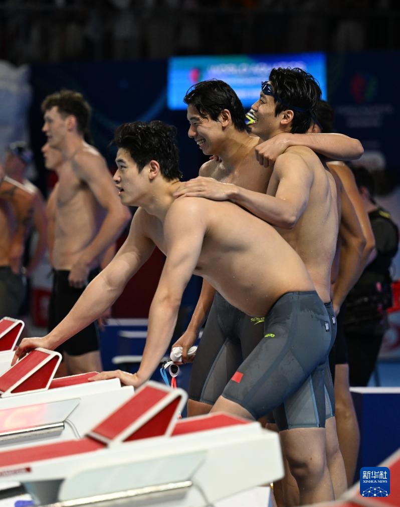 8月1日,中国队选手季新杰、汪顺与潘展乐在比赛后庆祝。最终,中国队获得亚军。