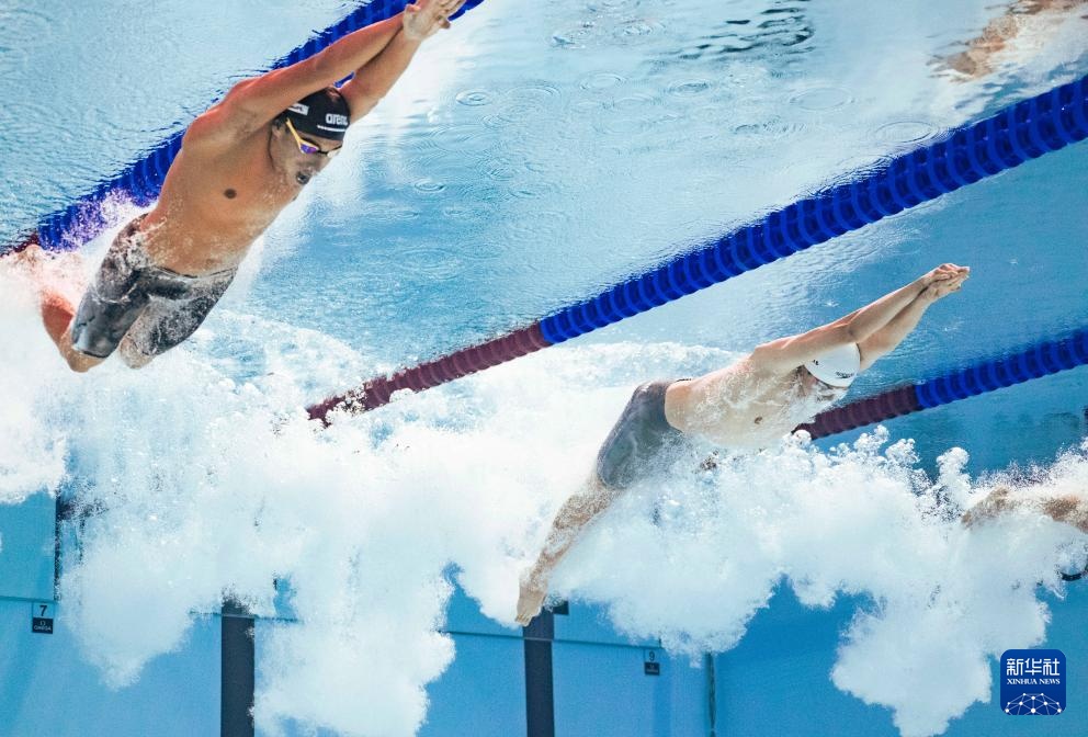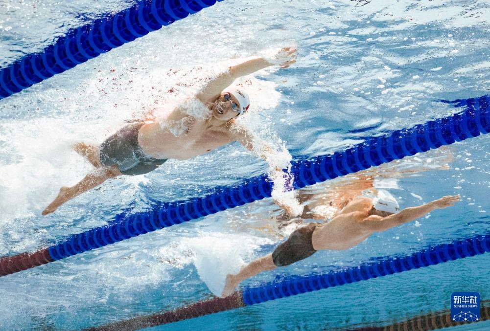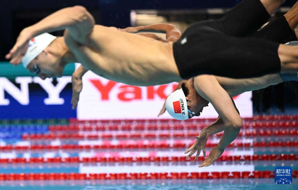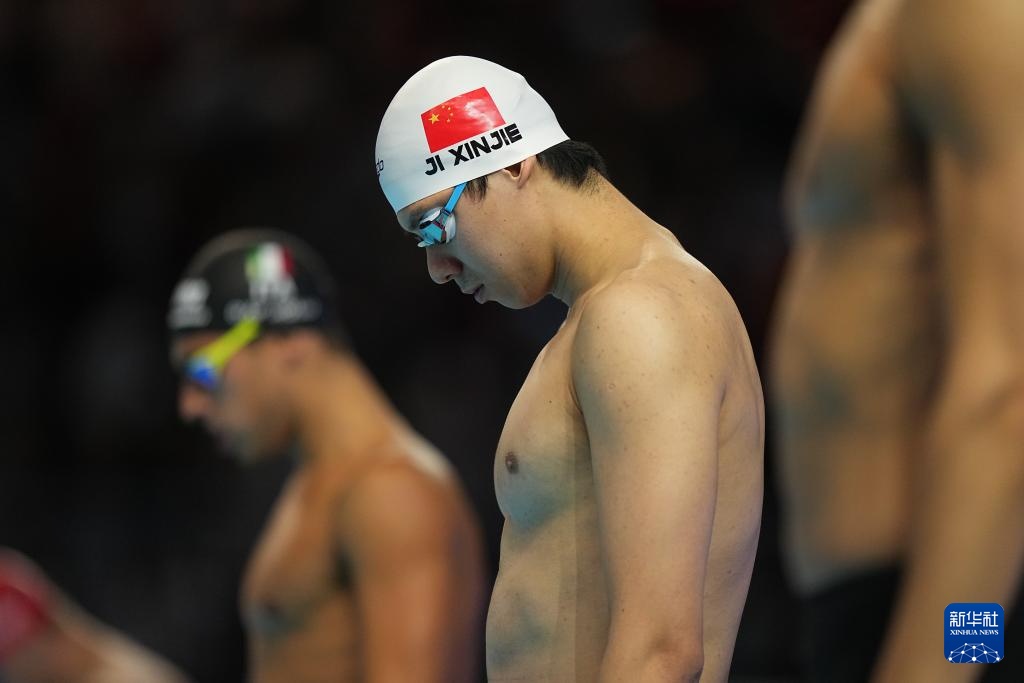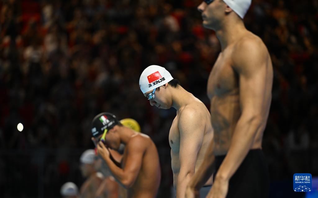 8月1日,中国队第一棒选手季新杰(右)在比赛中。最终由季新杰、潘展乐、汪顺、张展硕组成的中国队获得亚军。